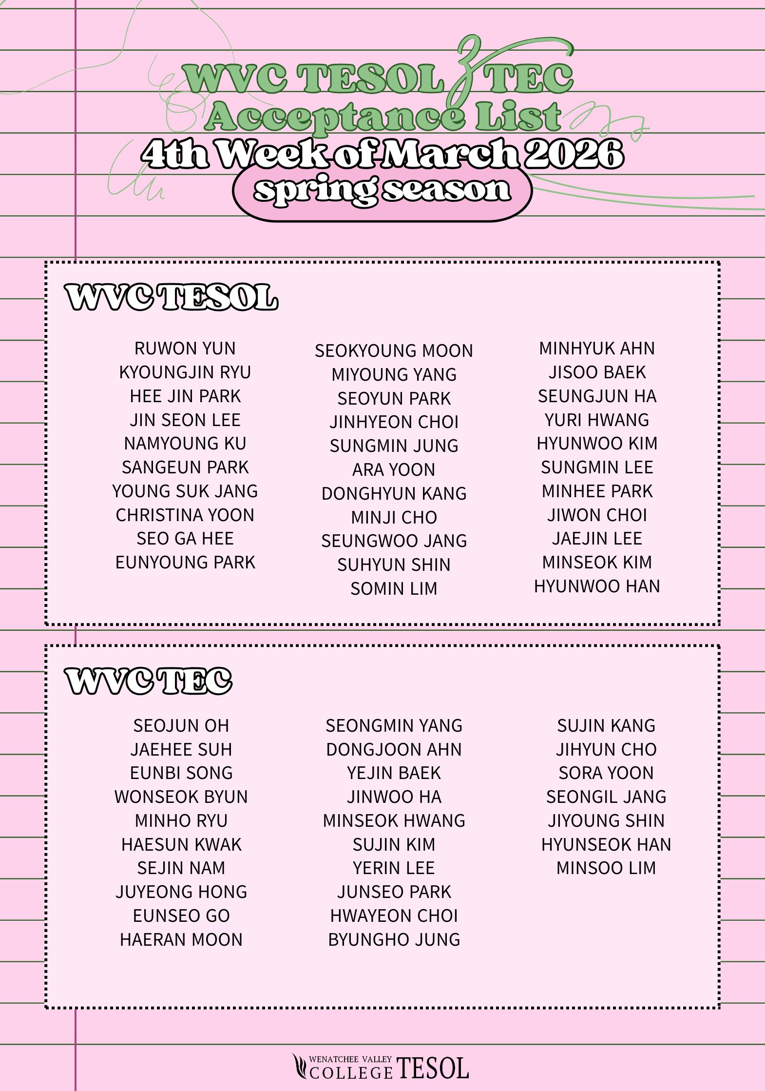 We are pleased to offer you TESOL/TEC acceptance at Wenatchee Valley College.