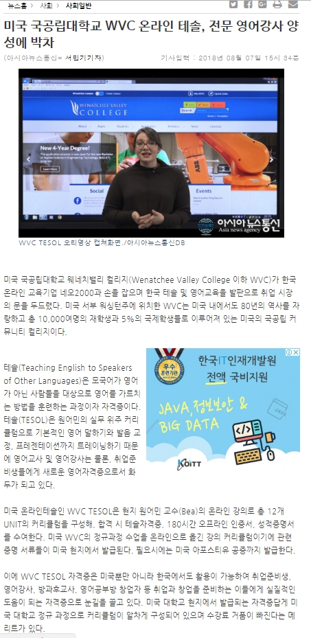 - 제목 : 미국 국공립대학교 WVC 온라인테솔, 전문 영어강사 양성에 박차