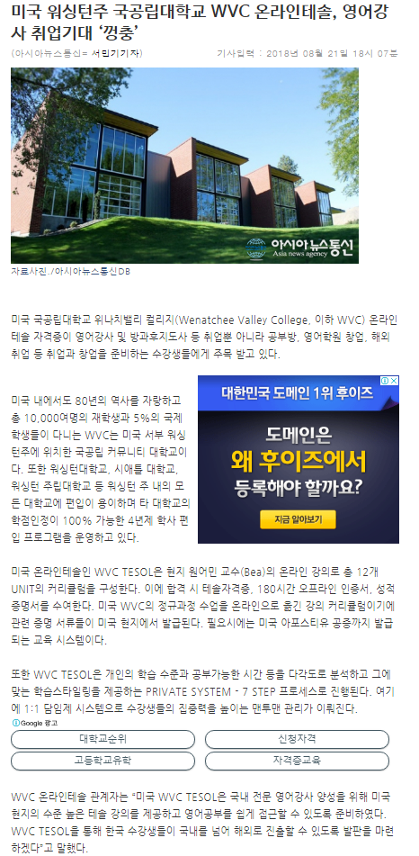 [미국 워싱턴주 국공립대학교 WVC 온라인테솔, 영어강사 취업기대 껑충]