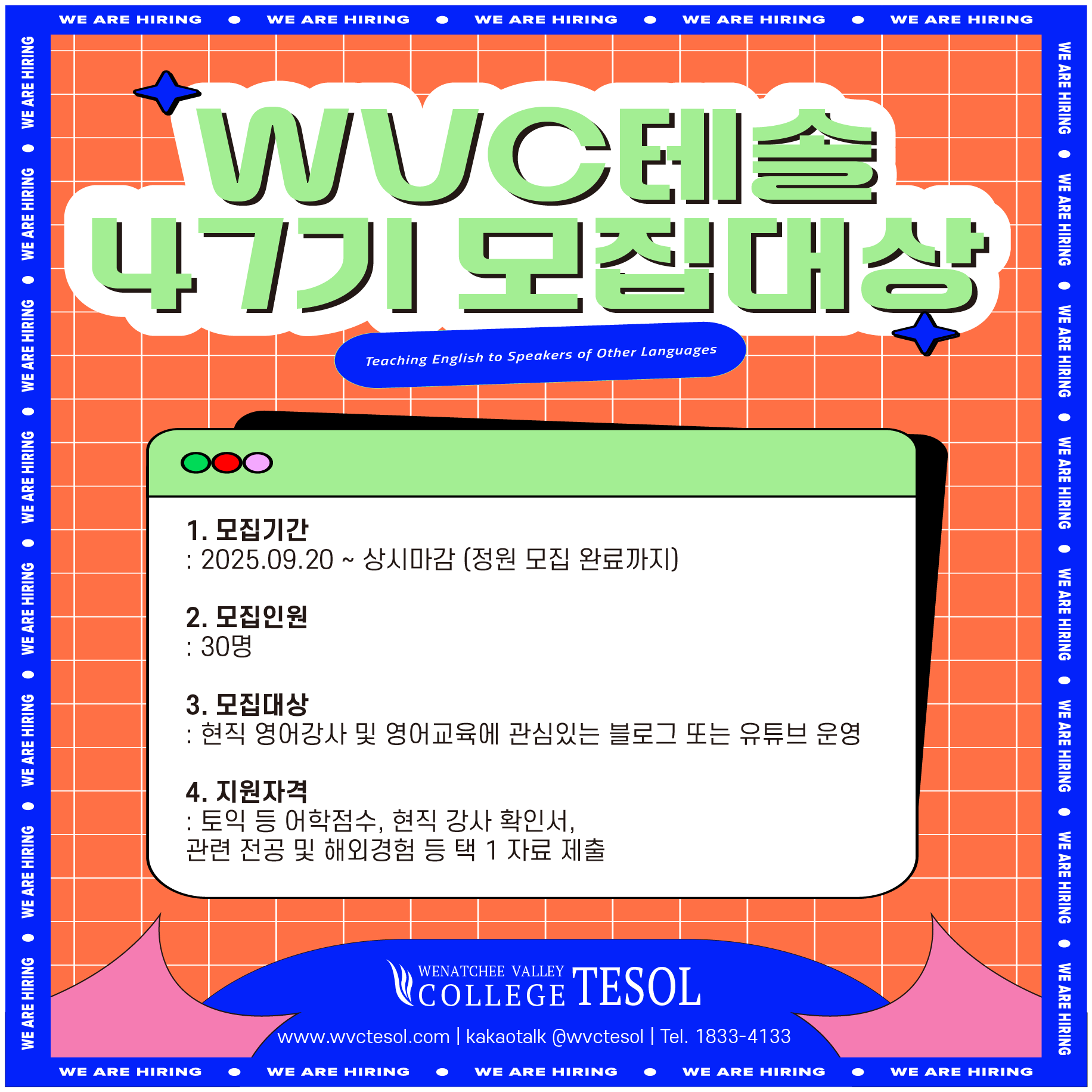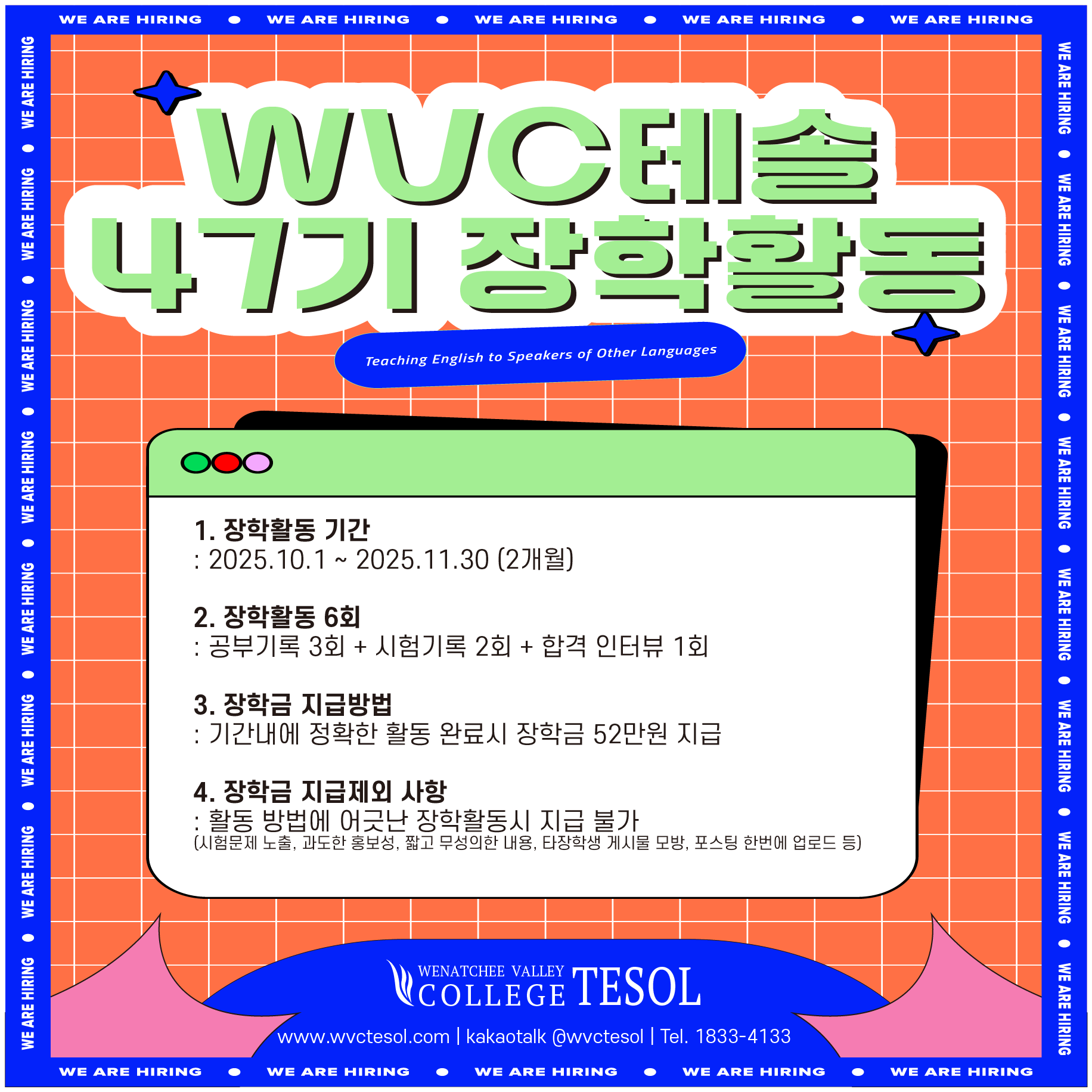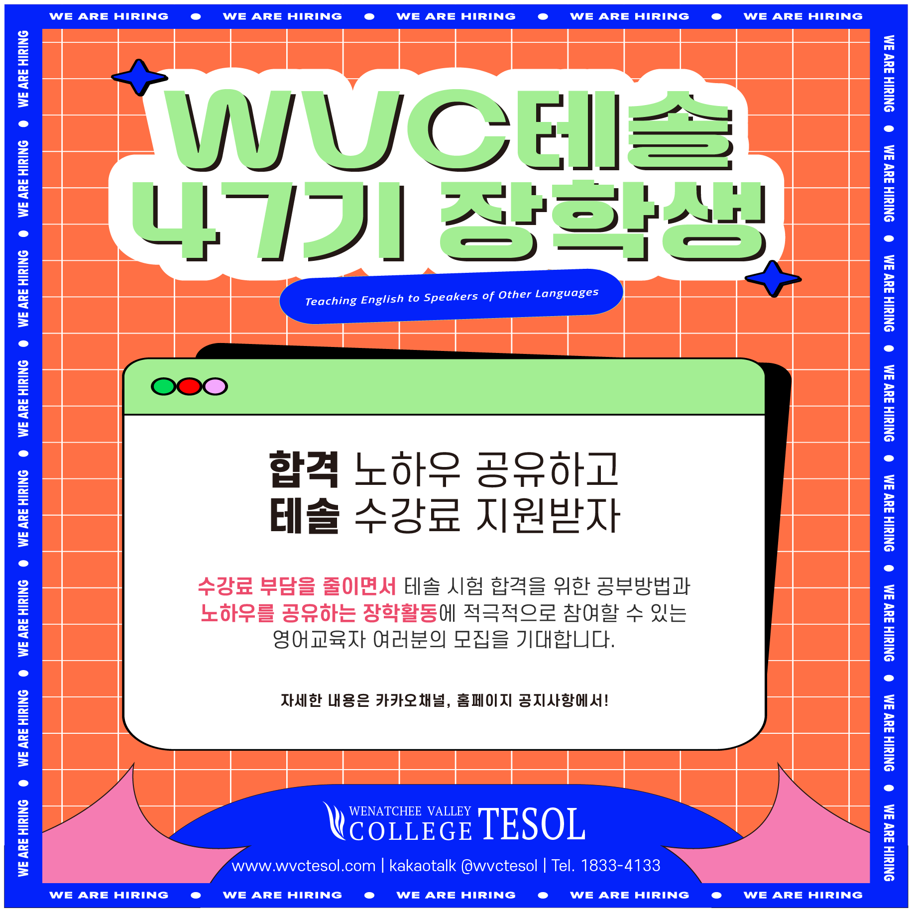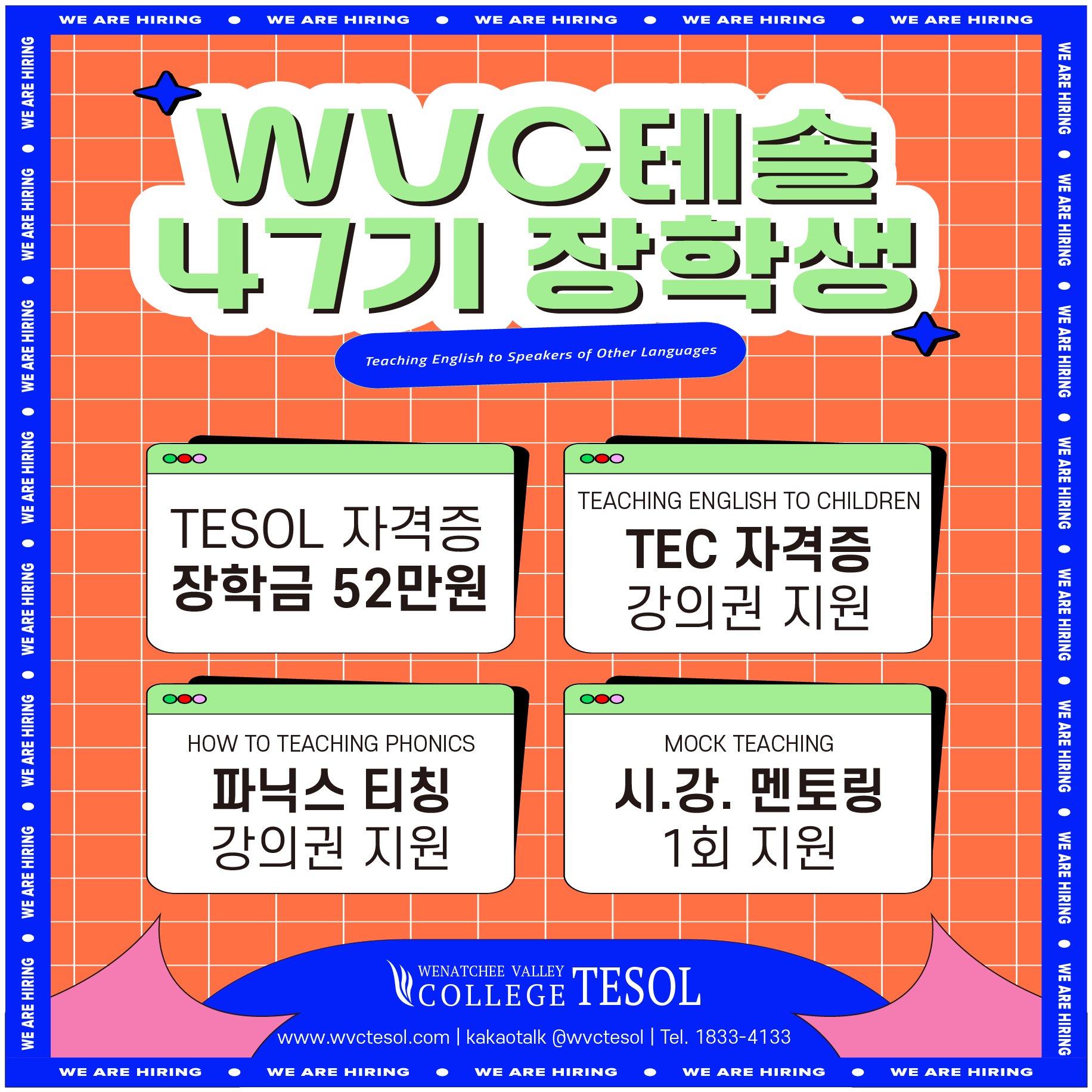 미국 Wenatchee Valley College TESOL 교육센터에서 47기 테솔 장학생을 모집합니다.