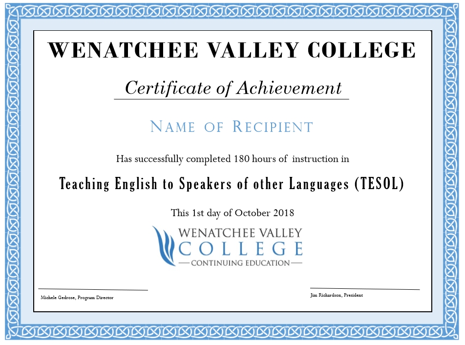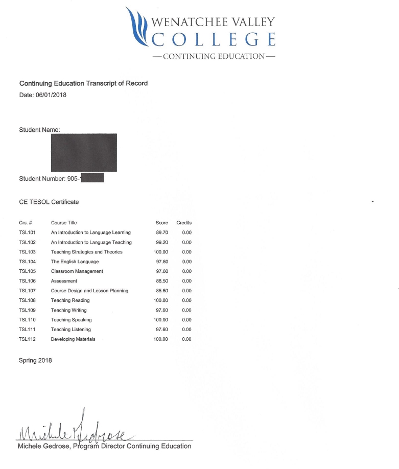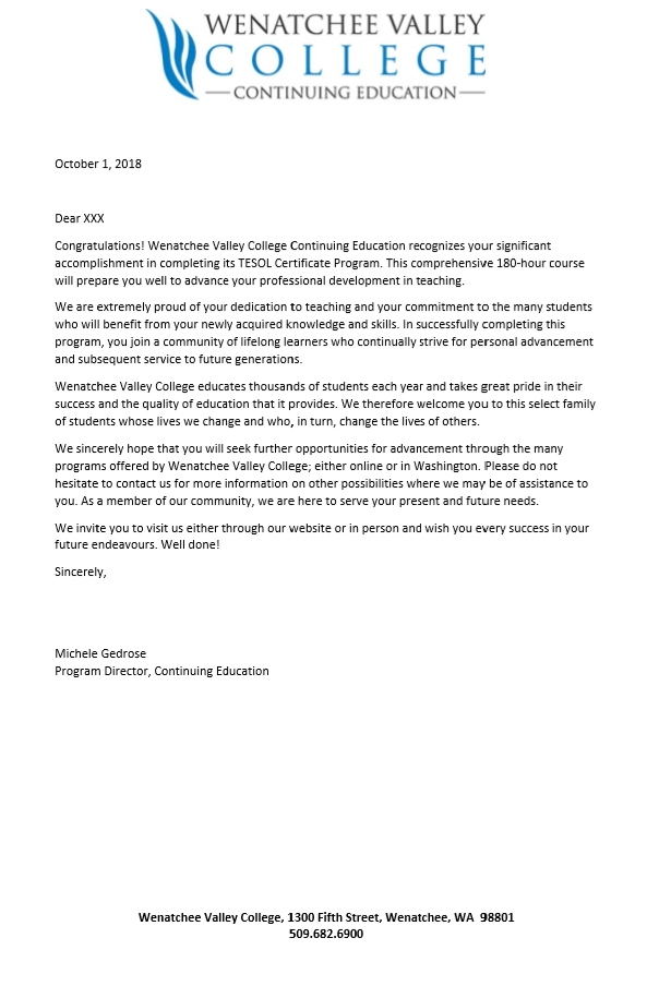 Wenatchee Valley College Online TESOL 자격증 발급안내 작성일 2018-07-09 작성자 조회수 22,260 # WVC TESOL 자격증 발급 안내 "WVC TESOL Certificate" "WVC TESOL Transcript" "WVC TESOL Congrats_Ltr" 첨부파일 다운로드 - 테솔자격증.jpg 목록