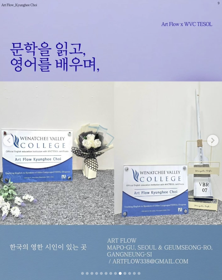 [수료현판 후기] WVC TESOL 자격증 취득으로 '아트플로우' 영어 교육 전문성 강화!안녕하세요, '아트플로우'를 운영하는 최경희(루체 베아트리츠)입니다. 드디어 WVC TESOL 자격증 현판을 걸고 국제 영어 교육 전문가의 꿈에 다가섰습니다. 아트플로우는 저의 문학적 삶과 예술적 감성이 모인 공간이자, 영어를 통해 세상..- 2025.12.19