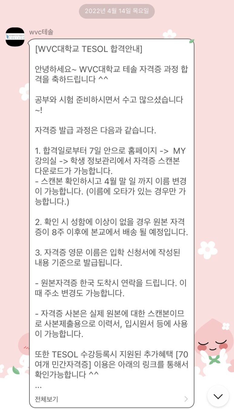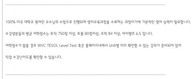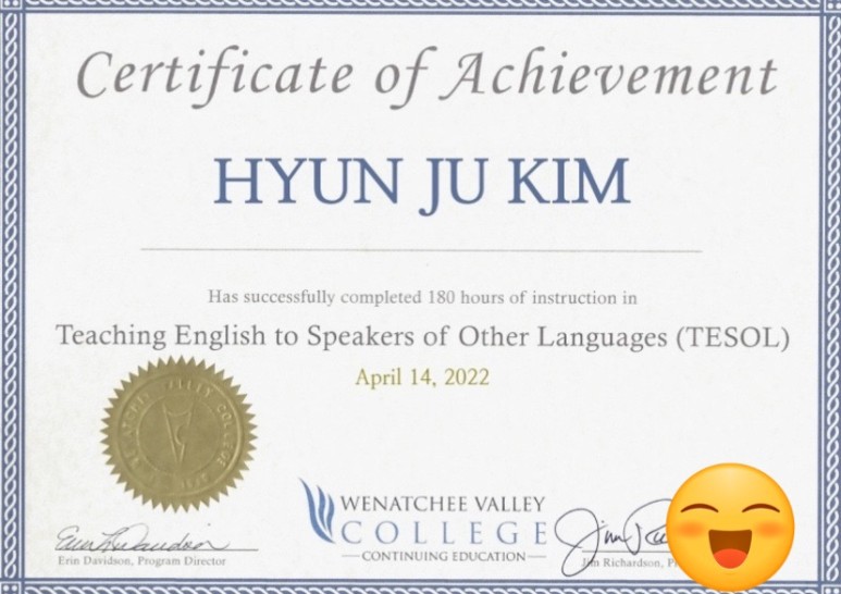 꼭 이력서에 한 줄 적는 게 다가 아니라 개인적으로 많이 배웠습니다.여러 온라인 테솔 기관중에서 WVC 테솔을 선택한 이유는 합리적인 비용과 실제 수강생들의 수강후기를 보고 선택하게 되었습니다. 교수님의 강의 내용 중에서 성인들은 선생님이 어떤 것을 할 때 의문을 가질 수도 있으니 이게 학생에게 어..- 2022.09.02