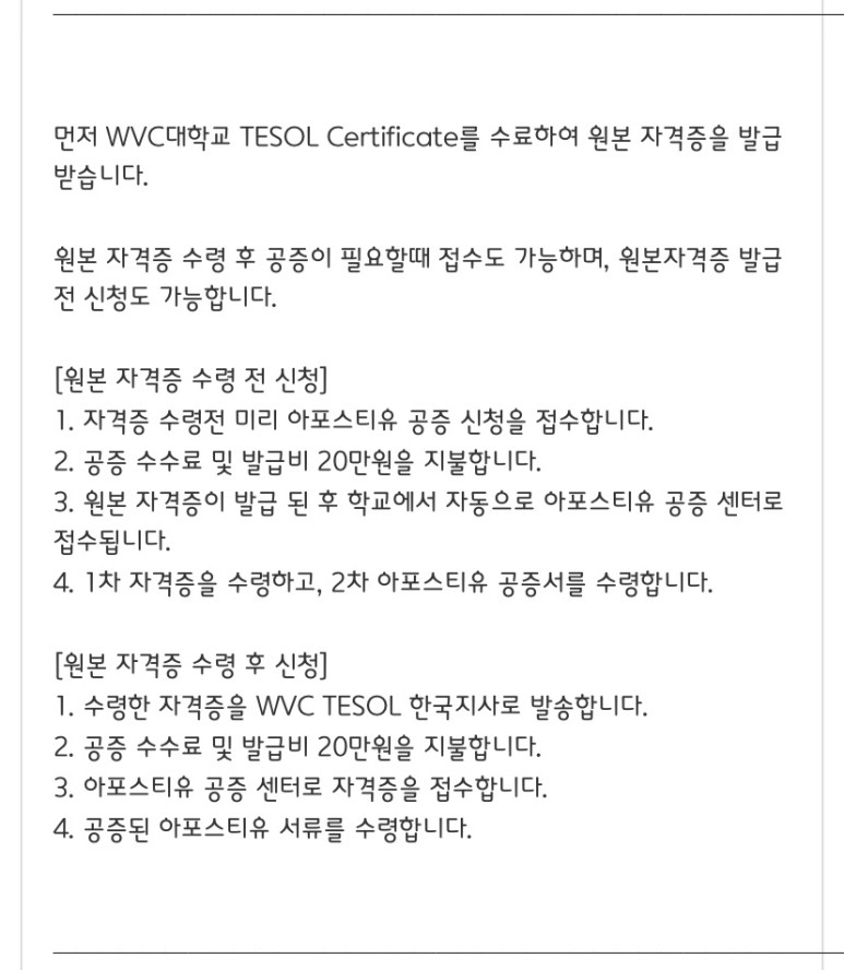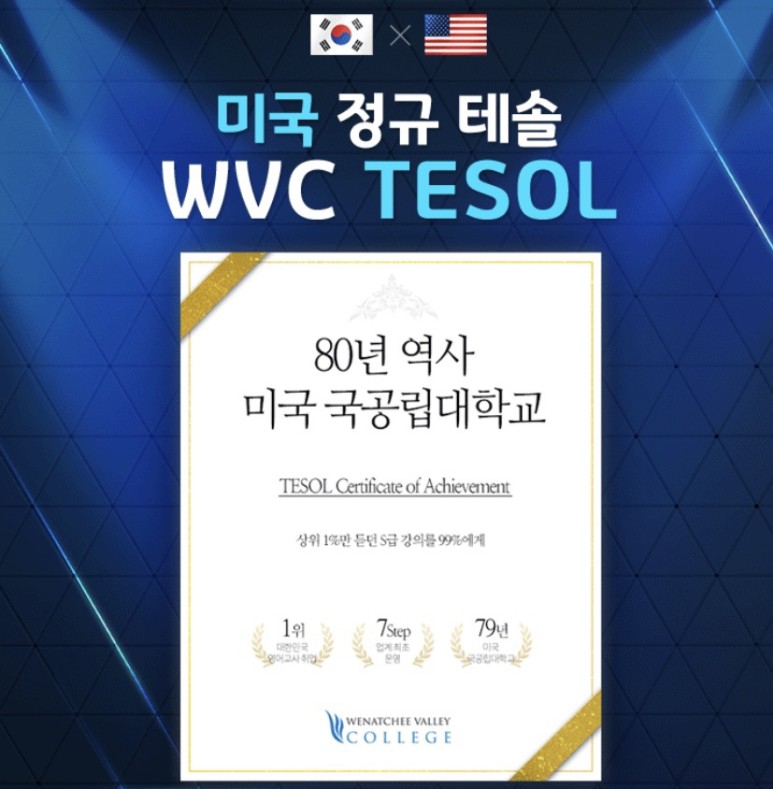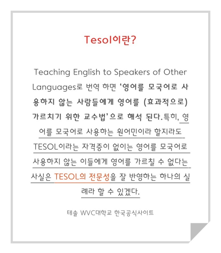 + TESOL Certificate(테솔 자격증)-WVC TESOL로 취득하기!TESOL(Teaching English to Speakers of Other Lauguages)이란 '영어를 모국어로 하지 않는 사람에게 영어를 가르치는 교수법'을 말합니다. 그렇다면 테솔은 왜 필요한가요?라고 질문을 주시는 분들도 계시는데요. 일단 테솔은 영어교육관련 취..- 2022.09.13