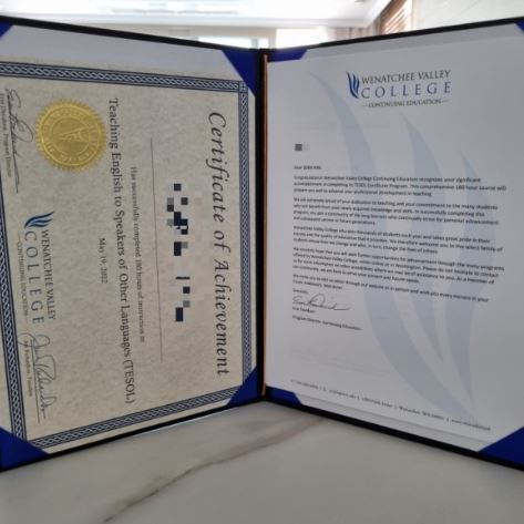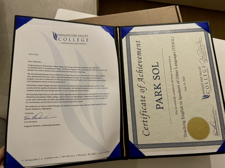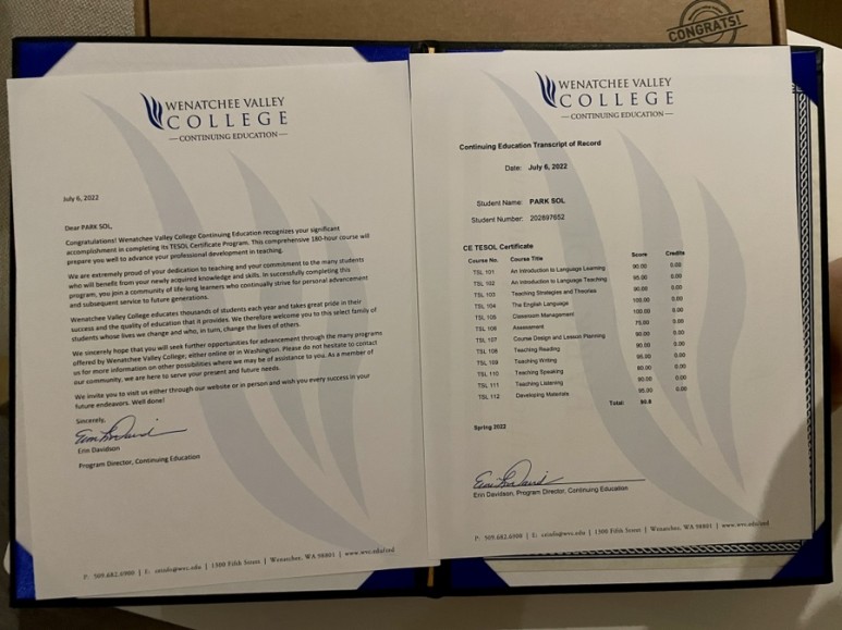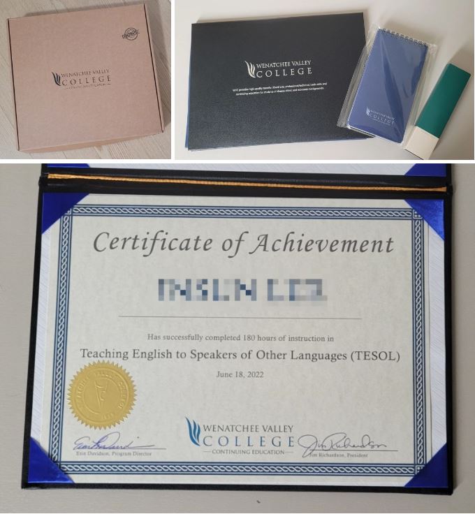TESOL Certificate, WVC테솔 자격증 합격, 해외배송 도착!안녕하세요. 제가 드디어 테솔 자격증을 받았습니다. 되게 큰상자에 왔는데요. 열어보면 이런식으로 왔는데, 하나씩 볼게요. 먼저 자격증! 제 이름이랑 이런식으로 자격증이 왔습니다. 오~ 되게 멋있게 준거 같아요. 미국에서 오느라고 두달 ..- 2022.10.05