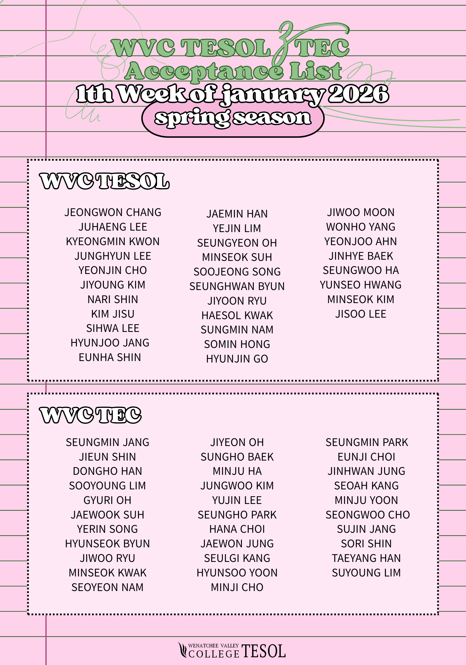 We are pleased to offer you TESOL/TEC acceptance at Wenatchee Valley College.