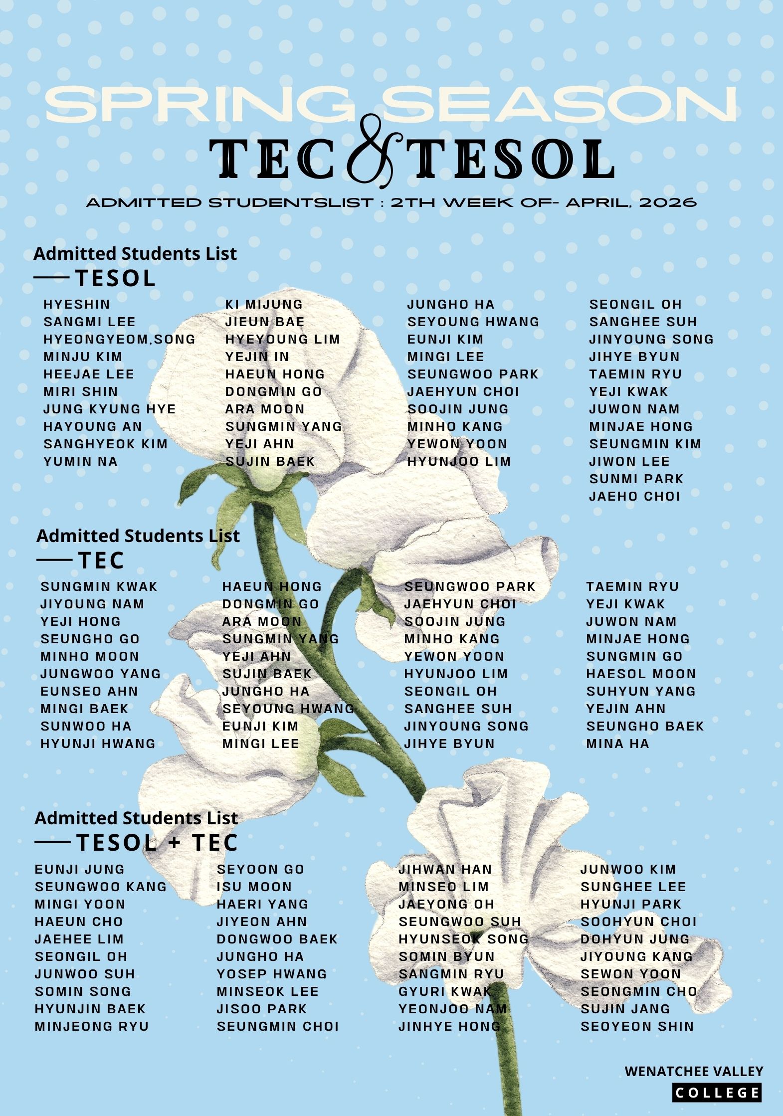 [입학생 리스트] 2026년 4월 2주 WVC TESOL / TEC