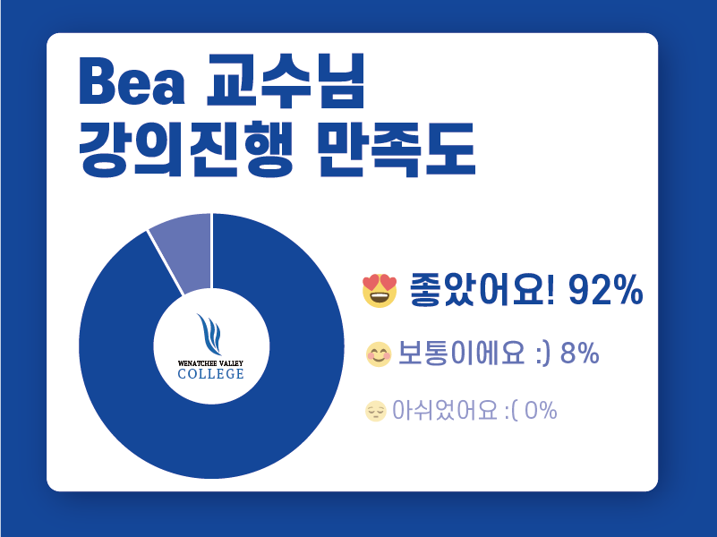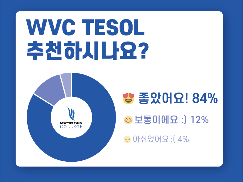 ![]() 92% 합격생이 WVC TESOL을 강력 추천하는 이유! 6월 설문조사 결과 대공개! WVC TESOL은 왜 수많은 테솔 과정 중 압도적인 선택을 받을까요? 6월 설문조사에 참여한 합격생들의 솔직한 답변에서 그 이유를 확인해보세요! ![]() [실제 합격생들의 수강후기] Unit12, 교수님의 수업 노하우가 녹아있고 열정적으로 설명해주셔서 도움이 많이 되었어요^^ 교육자의 기준이 아니라 학생 입장에서의 시각을 생각해볼 수 있었던 부분 실수를 두려워하지 않고 창의적인 방식으로 영어를 배우는 것이 더 효과적이라는 내용 Assessment - Error correct ![]() [실제 합격생들의 수강후기] 강의 영상 길이가 짧아서 공부하기 더 수월했던 것 같아요! 잘 알아듣게 천천히 또박또박 강의해주셔서 좋았어요 선생님 발음이 명확해서 좋았습니다. 교수님께서 학생들에게 이해하기 쉽도록 영어적 표현을 신경쓰심이 느껴져서 좋았습니다. 설명을 이해하기 쉽기 예시를 많이 설명해주셔서 좋았어요. ![]() [실제 합격생들의 수강후기] 카톡 답장도 빠르시고 궁금한 부분을 질문할 수 있어 좋았습니다 수강하는 일정에 대한 설명과 빠른 답변으로 저의 궁금했던 점을 신속하게 해결해 주신 점이 좋았어요. 친절하고 빠른 카카오톡 답장에 아주 만족했습니다. 응답속도가 매우 빨랐습니다. 불편한점이 없었습니다. 친절하게 응대해주셔서 편 ![]() [실제 합격생들의 수강후기] 학습자 중심교육으로 실제로 보여주신 다양한 활동 중심으로 재미있는 수업을 하고싶습니다! 수업의 전반적인 설계와 각 파트별 참고 자료등 Listening 과 speaking 관련된 수업내용을 실제 교육/수업으로 참고하고 싶습니다 귀납적 학습 등 수업에서 배운 접근법을 유용하게 적용할 것 같아요 ![]() [실제 합격생들의 수강후기] 영어 강의를 들을 수 있는 영어 실력이라면, 시험을 통과하는데는 크게 어렵지 않습니다! 영어가 전공이 아닌데도 단 시간 내에 TESOL 자격증을 취득할 수 있어 너무 기쁩니다. 직장과 병행해서 할 수 있는 점이 큰 장점이라 생각됩니다. 좋은 강의와 과정 감사합니다. ![]() 지난 6월 진행되었던 'WVC TESOL 합격생 만족도 설문조사'에 적극적으로 참여해주신 모든 합격생 여러분께 진심으로 감사드립니다. 여러분의 소중한 의견과 따뜻한 격려 덕분에 WVC TESOL이 더욱 발전할 수 있음을 다시 한번 깨닫게 되었습니다. 설문조사 결과, WVC TESOL의 커리큘럼, 서비스, 그리고 교육 현장 적용 가능성에 대한 평균 만족도가 86%에 달하는 것으로 확인되었습니다. 이는 WVC TESOL이 제공하는 교육의 질과 가치를 합격생 여러분께서 높이 평가해주셨다는 증거이며, 저희에게 큰 보람과 동기 부여가 됩니다. WVC TESOL과 함께 영어 교육 전문가의 꿈을 키워나가실 예비 수강생분들을 위해 [7월 프로모션], 많은 관심과 참여 부탁드립니다. 프로모션 및 수강에 대한 자세한내용은 카카오채널로 문의 부탁드립니다. |