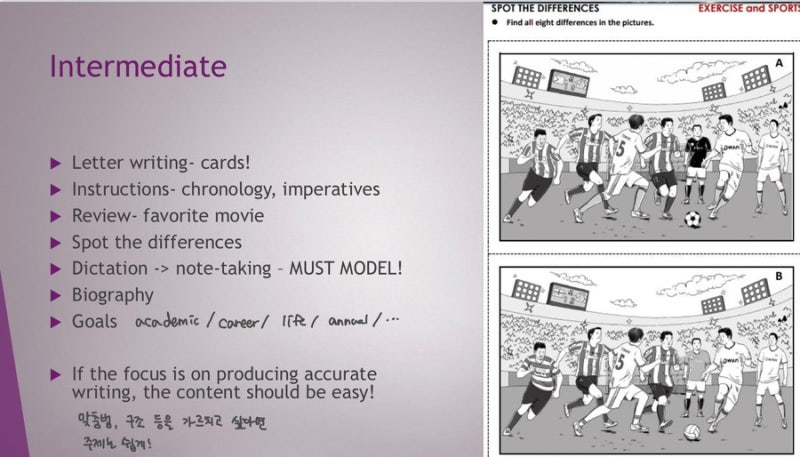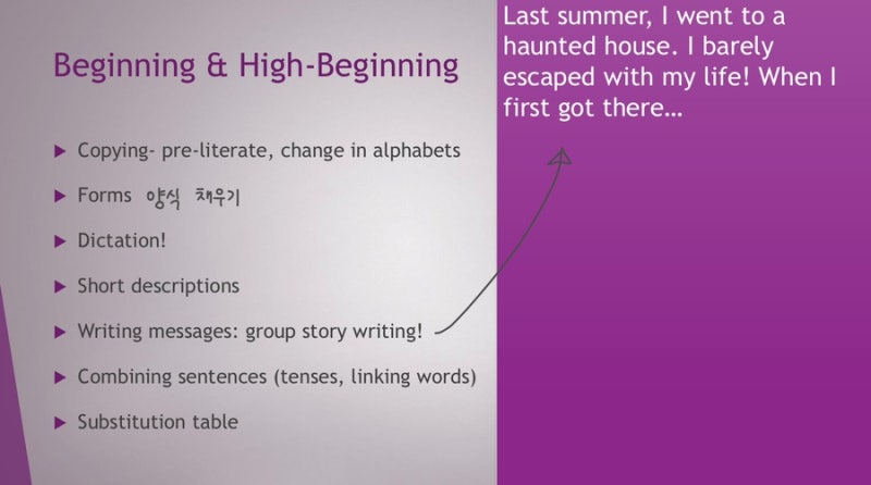 초급 수준에서는 빈칸채우기나 받아쓰기처럼 아주 쉬운 활동으로 시작해야 하고