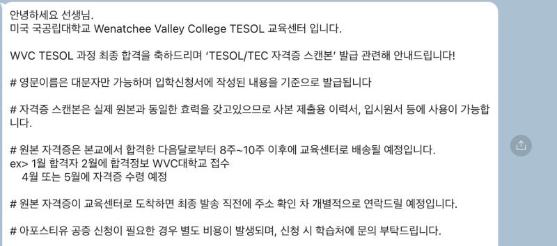 WVC에서 영어교육자격증 테솔을 따기로 결정한 게 잘한 선택인 것 같다