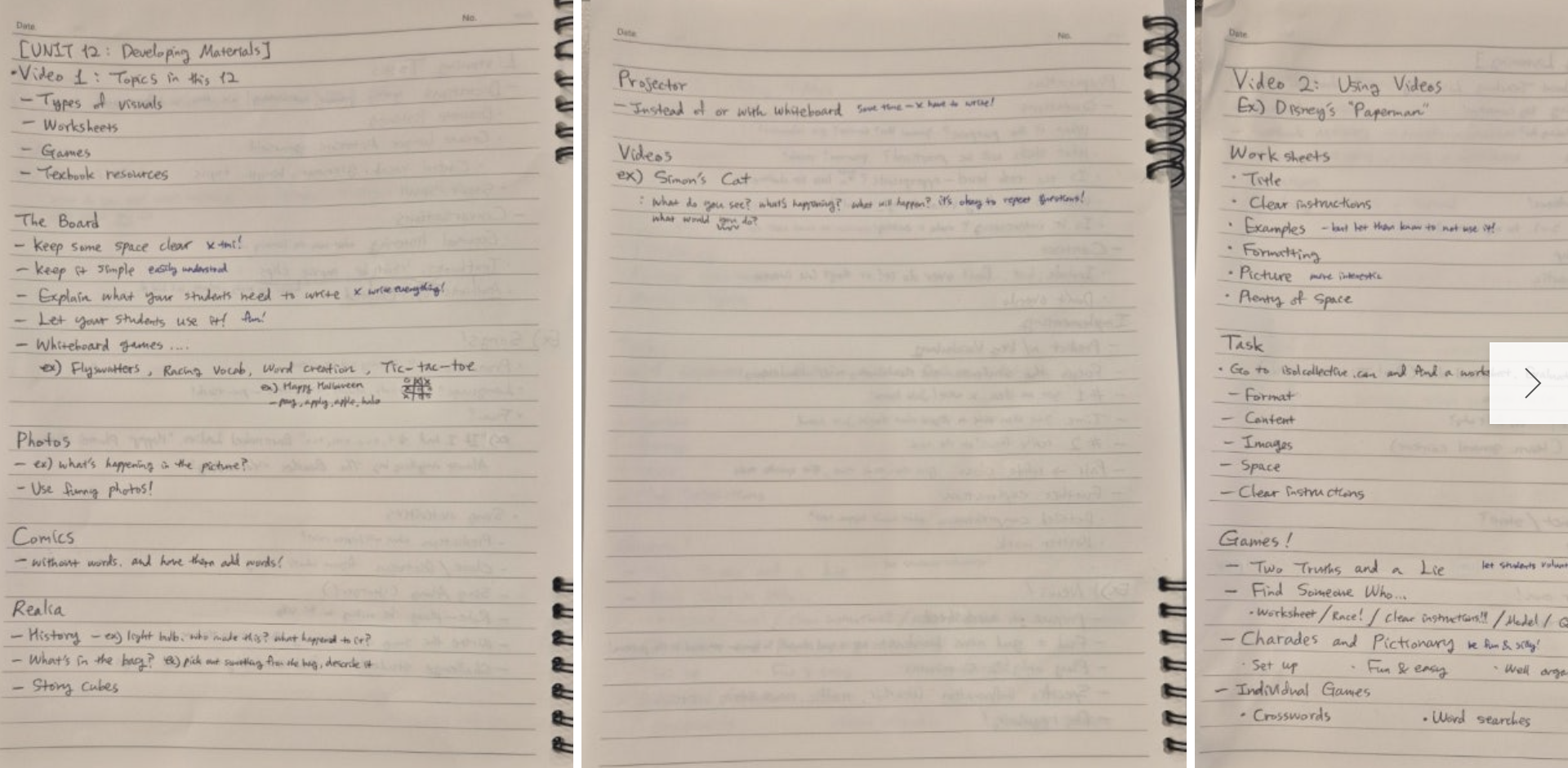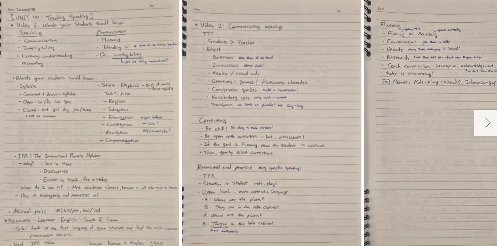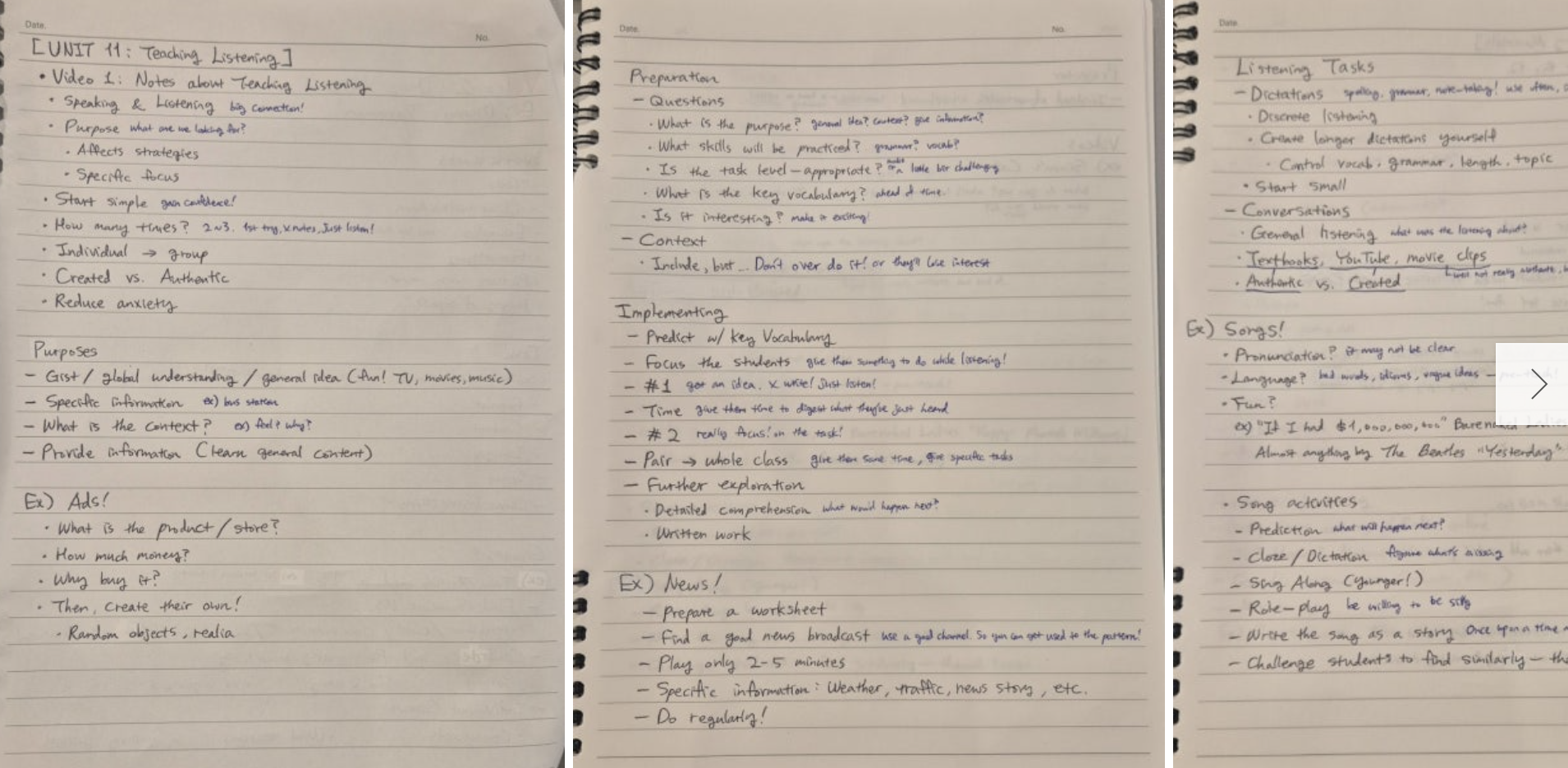 WVC 테솔 Unit 9~12 공부기록! 이제 거의 다 끝나간다. 열심히 공부해서 시험도 포스팅도 끝내버려야지 (왜냐면 오늘 저녁 스우파 시작해서 그거 시작하기 전에 공부를 다 끝내놓고 싶음) ![]() [UNIT 9 : Teaching Writing] WVC 테솔 Unit 9 에서는 쓰기를 어떻게 가르치는 지를 배운다. 쓰기와 말하기가 둘 다 문장을 만들어야 한다는 점에서 비슷하다고 생각할 수 있지만 그 둘은 사용하는 상황, 스피킹은 바로바로 피드백을 받을 수 있는 반면 라이팅은 그렇지 않는 등 사실 아주 다르다. 쓰기를 가르칠 때 효과적일 수 있는 예시 활동들에 대해서도 학생의 레벨 별로 가르쳐 준다. 틀린 거를 고쳐주지 말고 학생이 고칠 수 있도록 하고, 빨강색은 너무 무서운 색깔이니까 다른 색깔 펜으로 채점하는 게 좋다고 한다. Video 1 : Notes about writing in English - Writing is NOT Speaking - Feedback - Context - Organization - Style : too formal / informal (I / you / we) - Relevance -Vary tasks Kinds of communication : - Job applications - Text messages - Emails - Cards - Reminder notes - Social media - Work : notes, etc. - School - Recipes - Writing helps learning - Writing helps memory - Prepping for Tests - Note-taking Writing Strategies - What & Why - Transitions (ex. FANBOYS - for, and, not, but, or, yet, so) - Punctuation - Spelling - Organization - Form (type) Guided Writing Tasks - Clear & Concise - Scrambled sentences - Short answer - Scrambled stories Beginning & High-Beginning - Copying - pre-literate, change in alphabets - Forms - Dictation! - Short descriptions - Writing messages: group story writing! - Combining sentences (tenses, linking words) - Substitution table Video 2 : Fluency & Free-Writing Intermediate - Letter writing - cards! - Instructions - chronology, imperatives - Reviews - favorite movie - Spot the differences - Dictation -> note-taking - MUST MODEL! - Biography - Goals - If the focus is on producing accurate writing, the content should be easy! Advanced - Organization - Thesis statement - Details - Closing statement - Clear and Concise - Work with other teachers / professionals - Jobs, School - Note - taking - Scaffold! TED talks - Research Skills Fluency & Free-Writing - Mental block - teach about mistakes - Practice, practice, practice! - Choice - Groups - Time - Notes / Outline - Examples - Clear rubric Grading Writing - DON’T CORRECT FOR THEM! - Get a system (color, abbreviations, underline, circle, cross-out) - Be clear about what you’re grading! Video 3 : Q & A ![]() [UNIT 10 : Teaching Speaking] WVC 테솔 Unit 10에서는 말하기를 가르치는 방법을 배운다. 일단 대화를 위한 말하기와 발음을 위한 말하기는 다른 것들이다. 말하기를 가르치는 방법을 알려주기 전에 말하기를 배우기 위해 미리 배워야 할 단어들과 표를 먼저 공부해야 한다. 어려운 일이긴 하지만, 선생님보다 학생이 더 말을 많이 할 수 있도록 유도하기! Video 1 : Words your Students should know Speaking - Communication - Intelligibility - Listening, understanding, responding Pronunciation - Fluency - “blending in” - Or… intelligibility Words your students should know - syllable = consonant + vowel - stress : EMphasis - Revision - Education - Examination - Constitution - Revolution - Computerization - IPA : The international Phonetic Alphabet - Why? See vs. Hear / Dictionaries / Easier to teach, fix mistakes - When do I use it? More academic classes because it takes time to learn all of them - Use it everyday and memorize! Minimal pairs - bit / pit - bed / bad Video 2 : Communicating meaning TTT - Students > Teacher - Elicit - Questions - Instructions - Realia / visual aids - Gestures : games! Pictionary, charades - Conversation guides - Vocabulary sets - Translation Correcting Speaking - Be chill! - Be open with activities - but… anticipate! - If the goal is fluency, allow the students to continue. - Then, gently elicit corrections. Restricted oral practice - TPR - Situation -> Student - Upper levels - more authentic language. - A: Where are the plates? B: They are in the left cabinet. - A: Where are the plates? B: They’re in the left cabinet. Fluency - Fluency vs. Accuracy - Conversation - Debate - Research - Teach conversation: interruption, acknowledgement, listening - Make it interesting! Ex) Games, Role-play(visuals!), Information-gap, Plans Video 3 : Q & A ![]() [UNIT 11 : Teaching Listening] WVC 테솔 Unit 11에서는 영어 듣기를 어떻게 가르칠 수 있는지에 대해 배운다. 어떤 목적을 가지고 리스닝을 하느냐에 따라 그 방법도 달라진다. 난이도는 너무 쉽게 보다는 조금 어려운 듯한 느낌이 좋다. 하지만 시작은 쉽게 하는게 좋음! 리스닝을 하기 전에 단어나 조금의 정보를 주면 부담없이 리스닝을 할 수 있다. 하지만 너무 많은 것을 알려주면 흥미를 잃을 수 있으니 주의! 리스닝을 하며 하는 활동들은 다양할 수록 좋다. Video 1 : Notes about Teaching Listening - Speaking & Listening - Purpose - Affects strategies - Specific focus - Start simple - How many times? - Individual -> group - Created vs. Authentic - Reduce anxiety Purposes - Gist / global understanding / general idea (fun! TV, movies, music) - Specific information - What is the context? - Provide information (learn general content) Ex) Ads! - What is the product / store? - How much money? - Why buy it? - Then, create their own! - Random objects, realia Preparation -Questions - What is the purpose? - What skills will be practiced? - Is the task level-appropriate - What is the key vocabulary? - Is it interesting? -Context - Include, but… - Don’t overdo Implementing - Predict w/Key Vocabulary - Focus the students - #1 - Time - #2 - Pair -> whole class - Further exploration - Detailed comprehensio