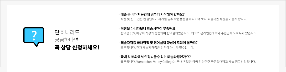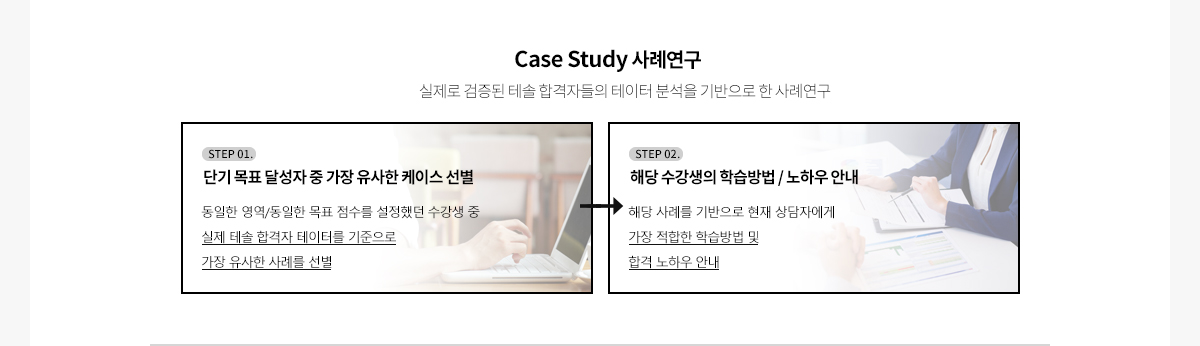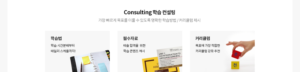 방향을 잡아주는 힘 전문상담선생님의 1:1 컨설팅 아무리 좋은 강의가 있어도 나에게 맞는 커리큘럼을 찾지 못한다면 한번에 합격 달성이 어렵습니다. 현재 위치를 알려주고, 앞으로 나아갈 길을 보여드리겠습니다.